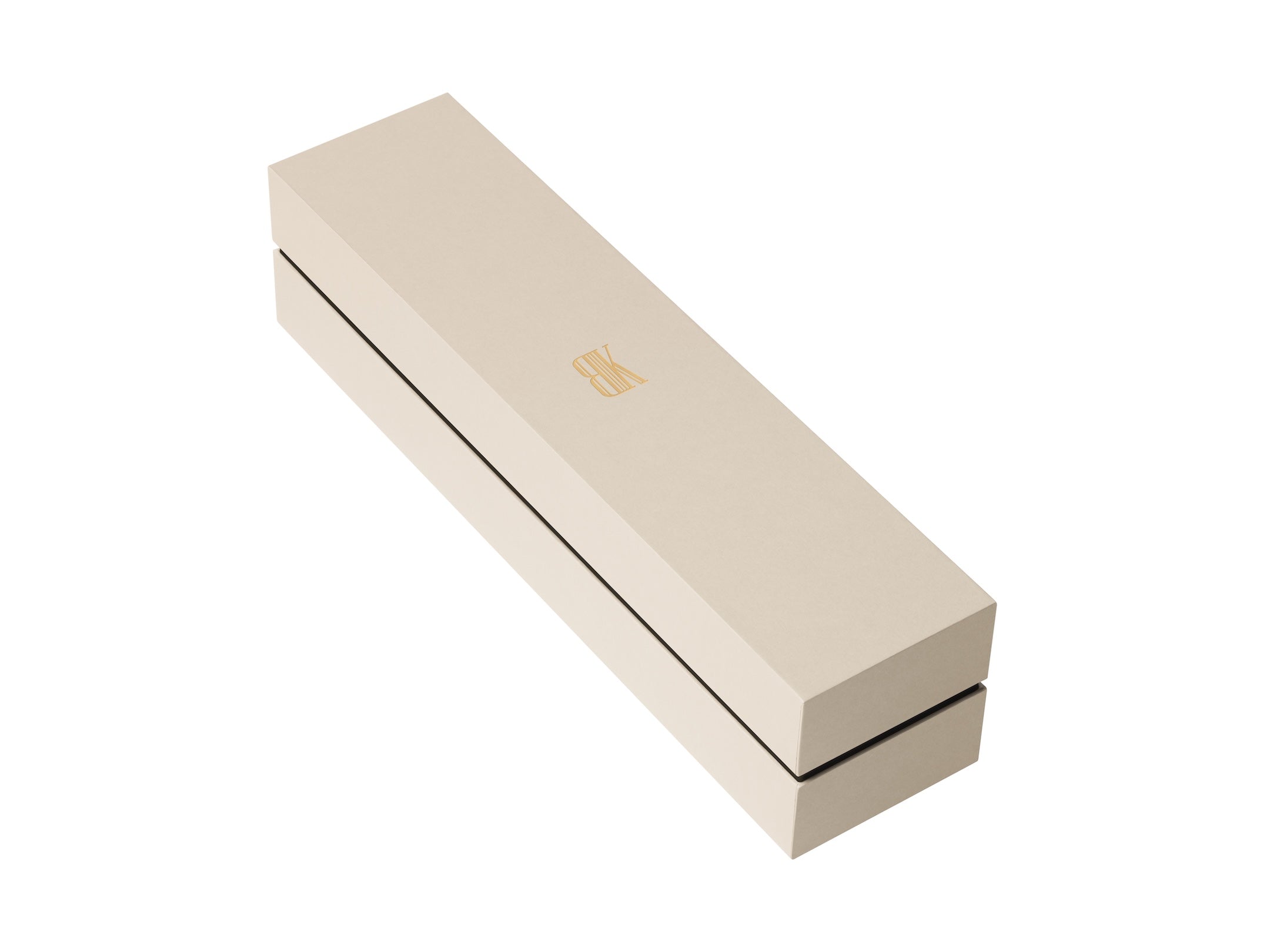 The candle holder is delivered in a beige gift box with B&K logo in gold on the lid and a black shoulder around. Dimensions are 41 x10x9,5 cm.