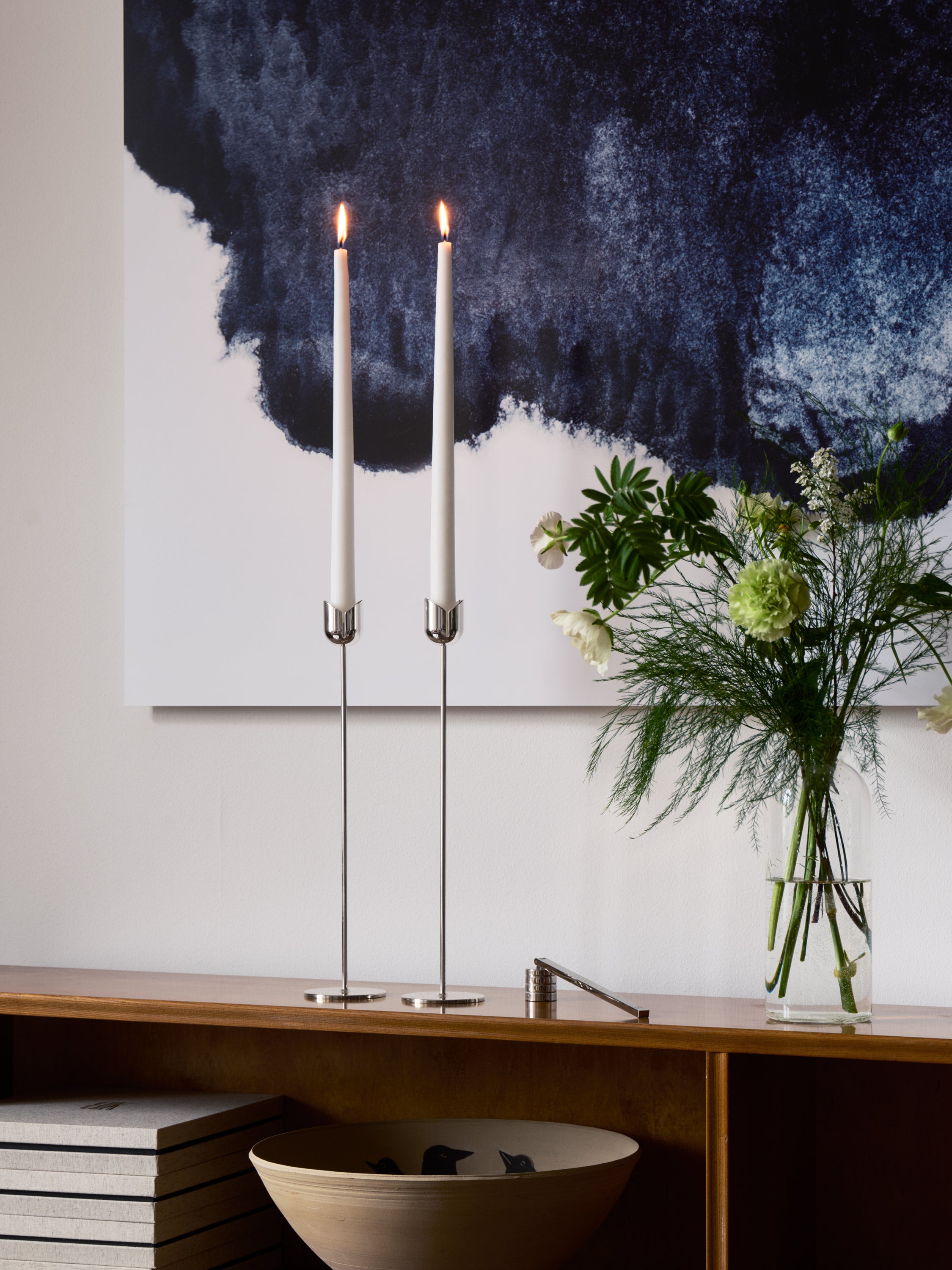 Handcrafted in Sweden from solid silver plated brass and polished to a mirror-like finish, this tall edition is designed with a unique purpose: to reflect candlelight from just the right angle. The result is more than ambience—it is atmosphere that flatters. As the flame dances in the tulip-shaped crown, soft golden light is cast outward and downward, illuminating the table and enhancing the beauty of those gathered around it. An elevated expression of warmth, celebration, and togetherness.