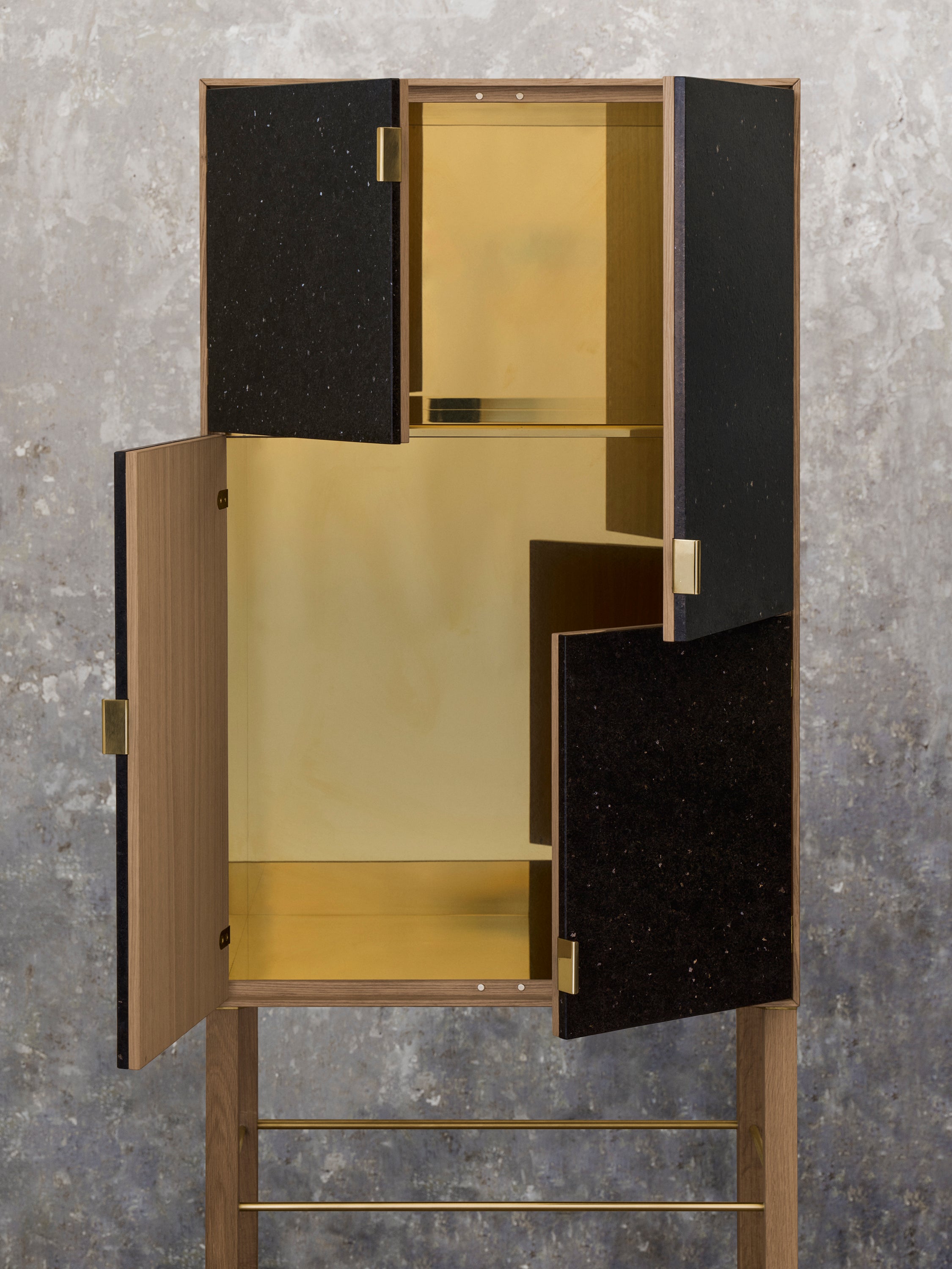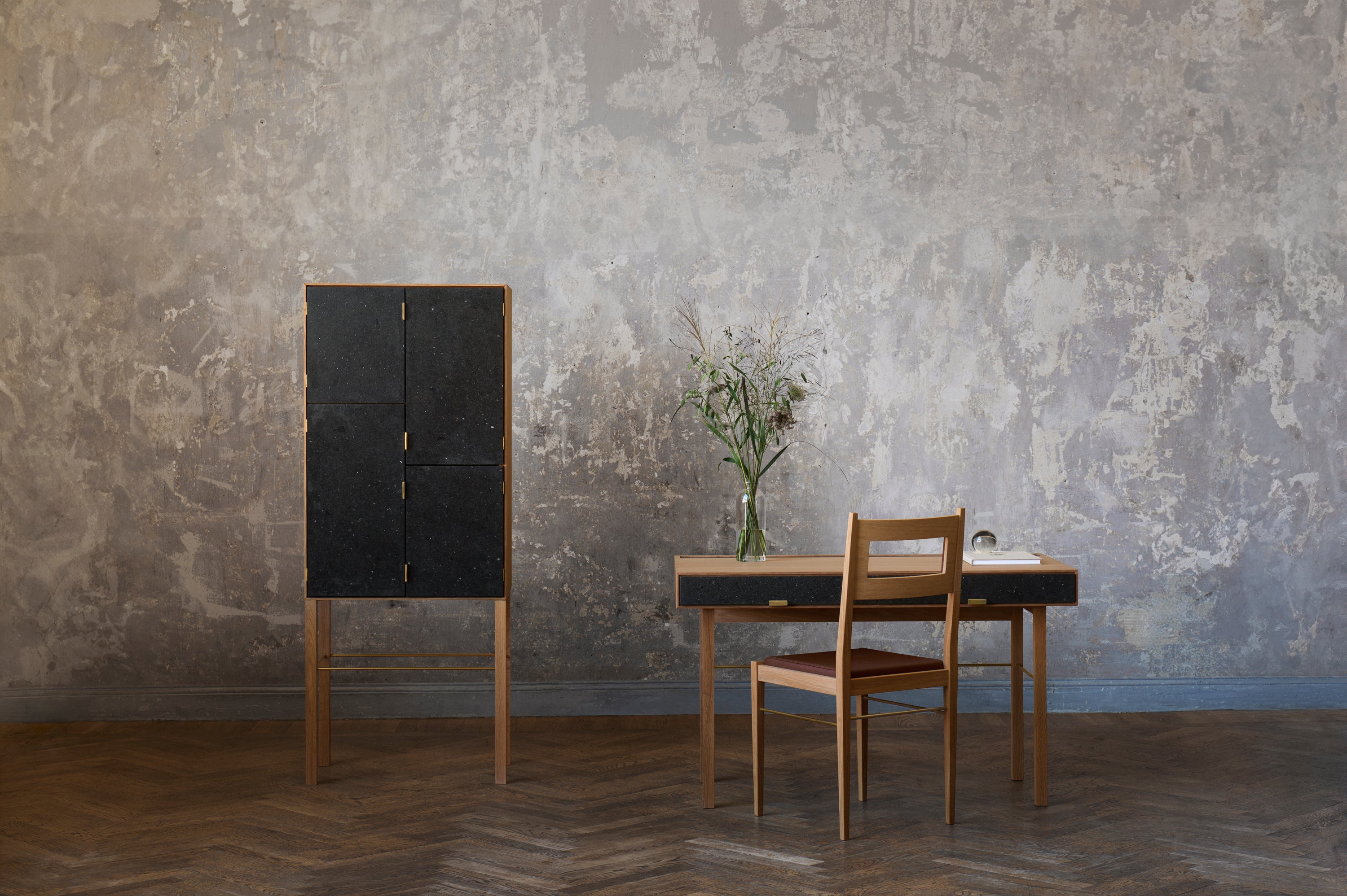 The exclusive cabinet, "Eriksberg Cabinet," with its unique diabase doors are designed with inspiration from the irregularity and natural textures of diabase, giving the cabinet a distinct and lively character. Made from oak, this cabinet elegantly combines design with functionality, offering generous storage space. The brass details subtly capture and reflect the light in the room, creating a warm and inviting atmosphere.