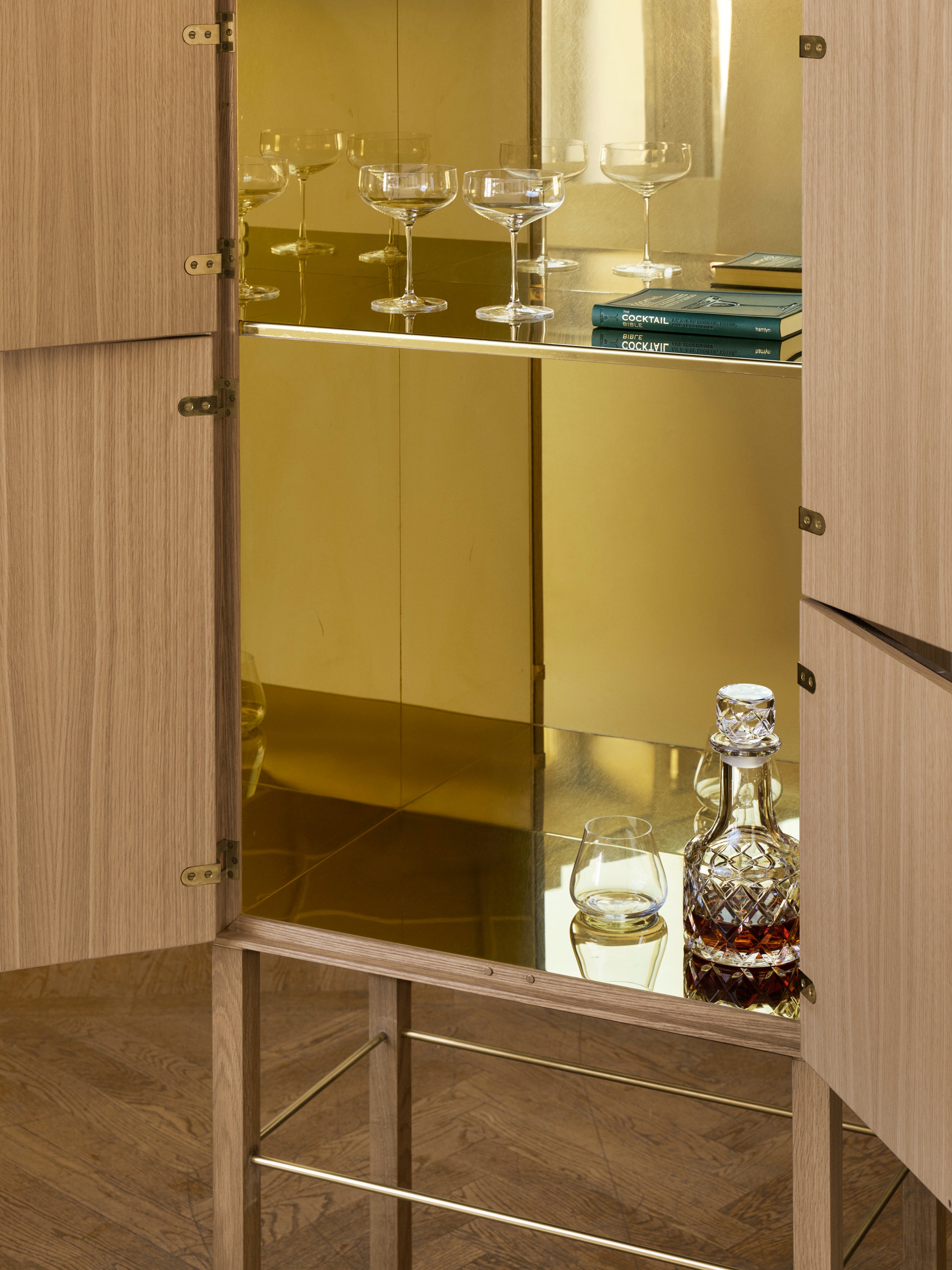 Materials: Oak, Doors covered with diabase/ bishop black clamps brass, undercarriage support in brass.