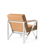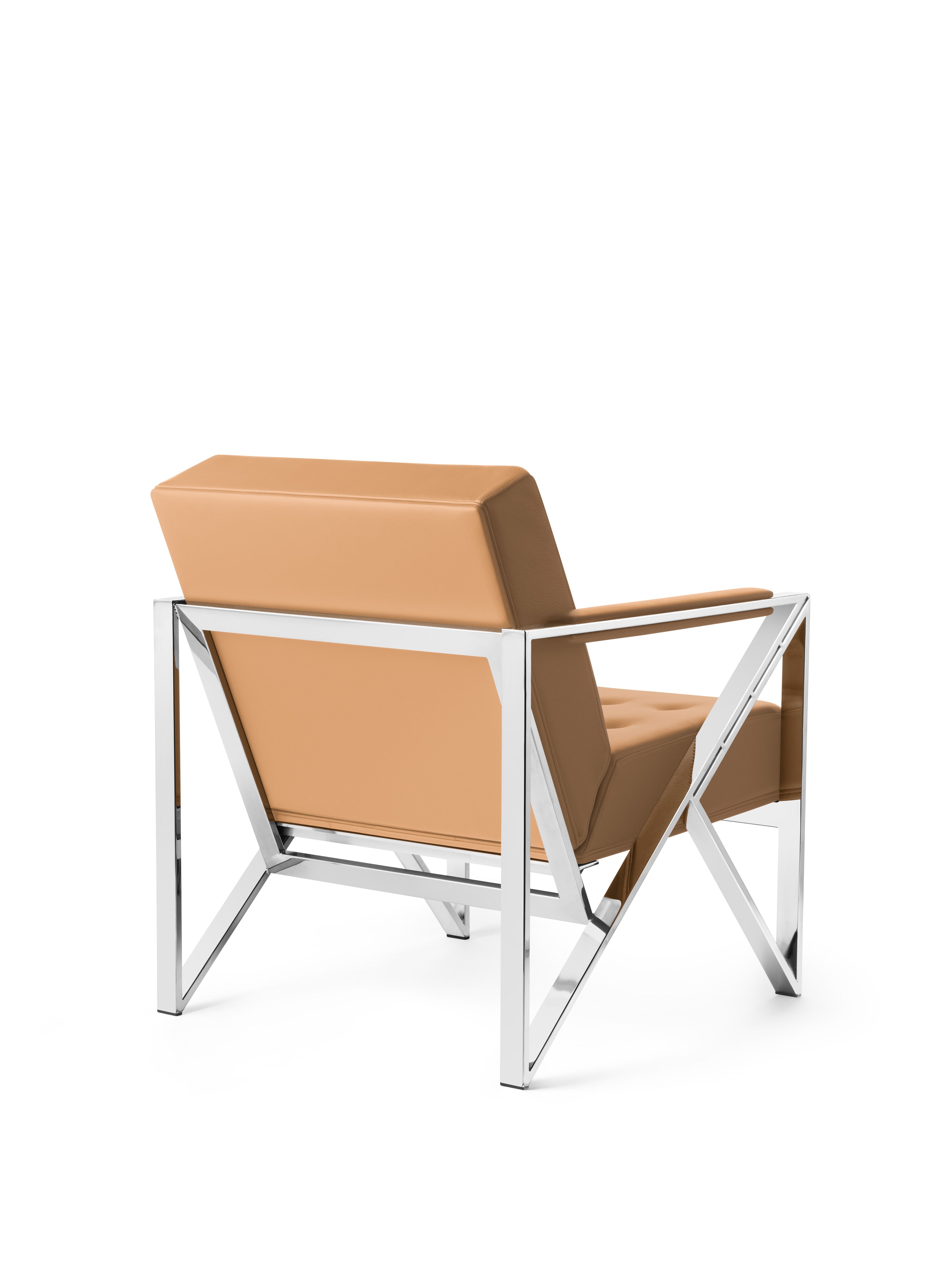 The Stratum Armchair takes direct inspiration from angular architecture, with triangular geometry reflected in the structure of the legs and the overall form. The armchair combines a polished steel frame with an upholstered leather seat and back, creating a balanced contrast between structural clarity and comfort.