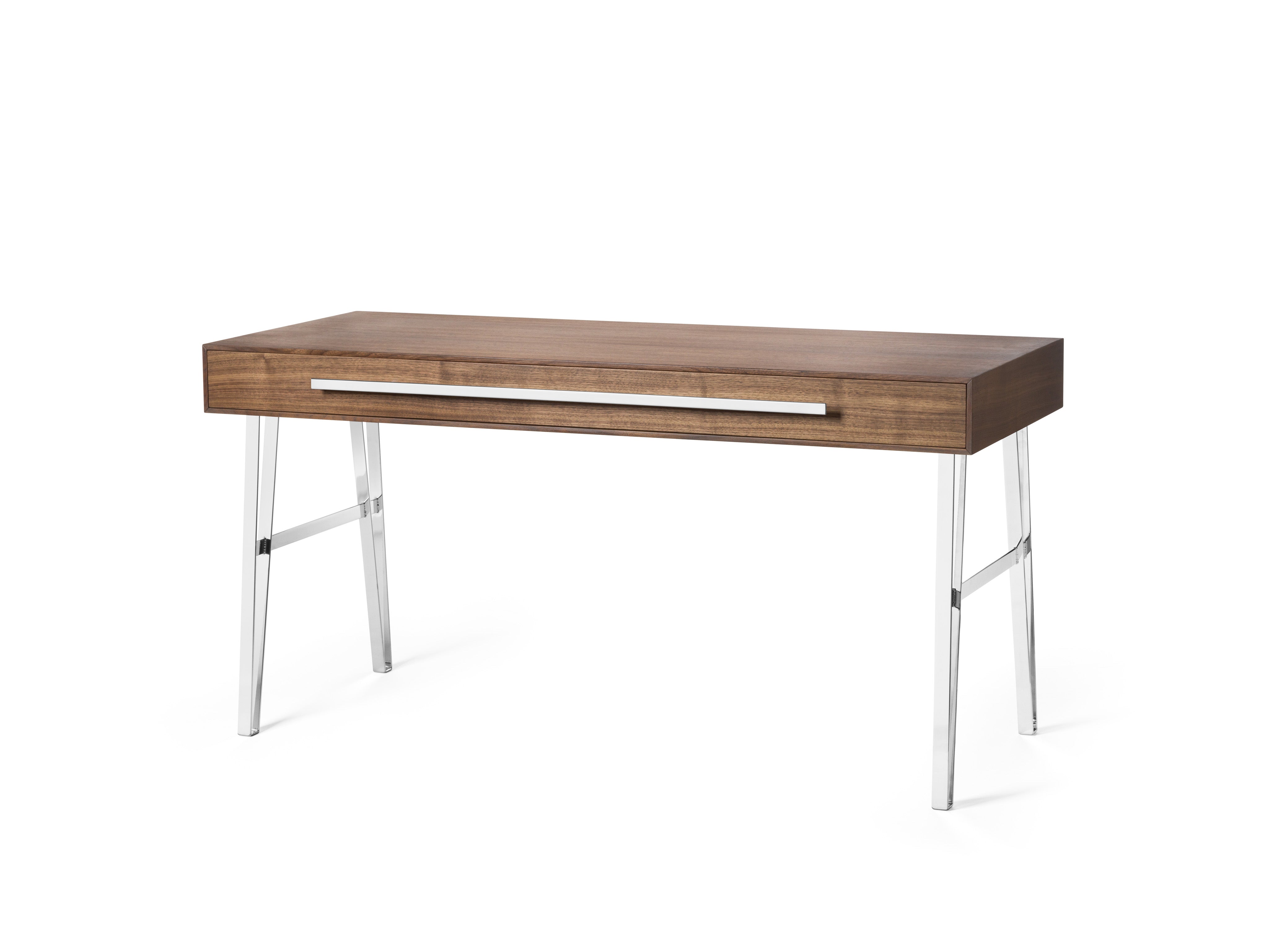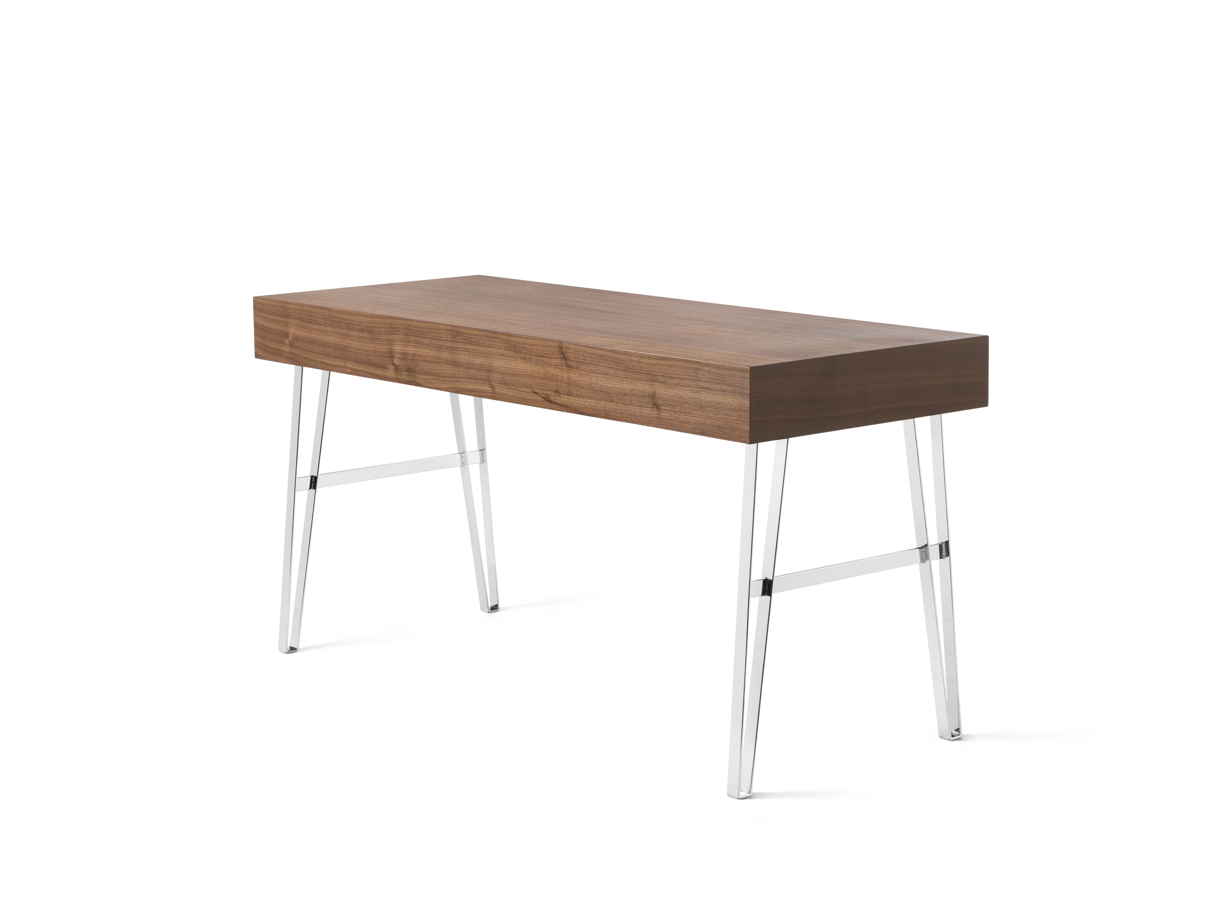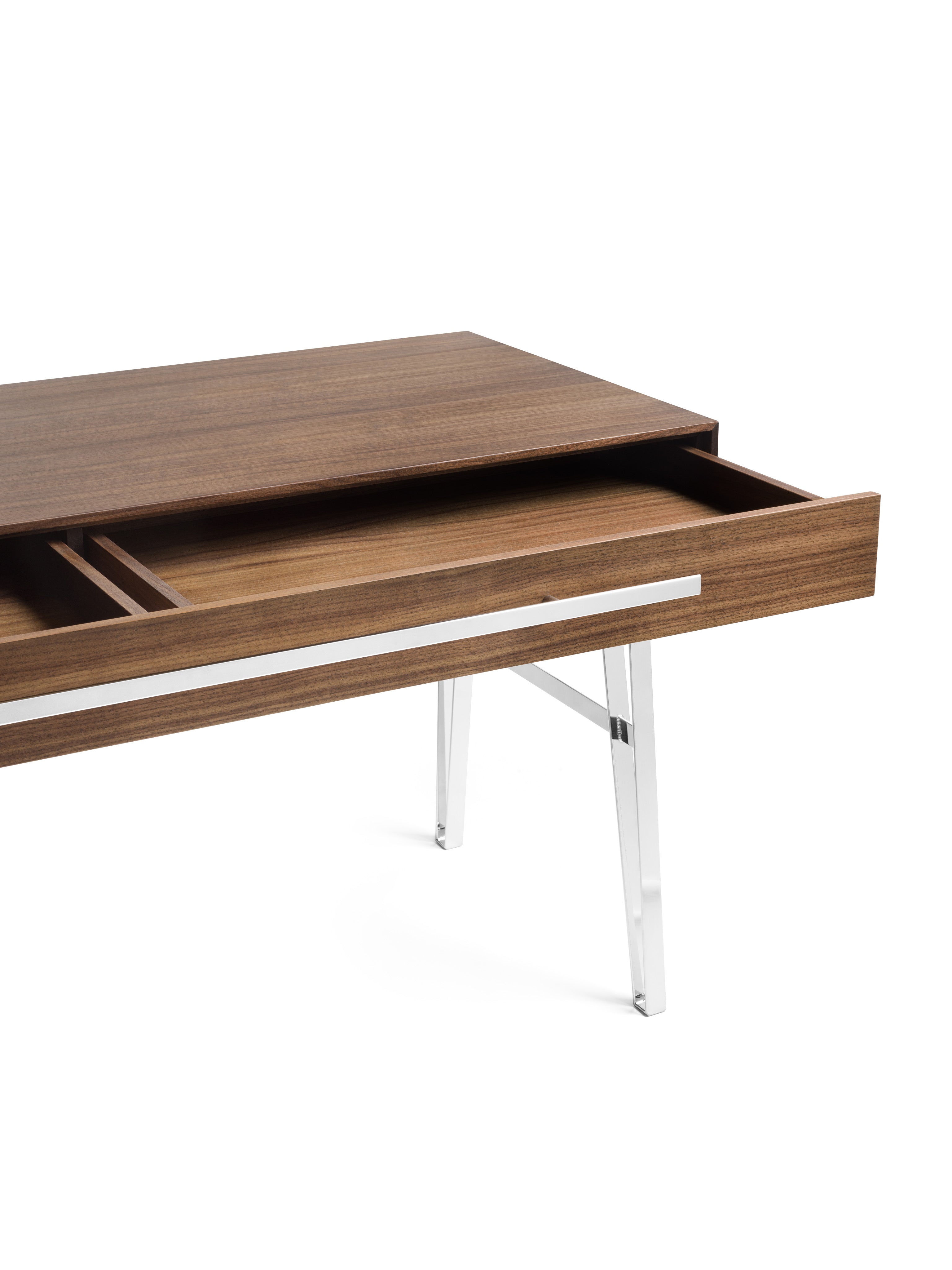 Inspired by angular architecture, the desk combines a precisely crafted walnut tabletop with a polished steel structure. A generously sized integrated drawer offers practical storage and is fitted with a discreet handle and a smooth, soft-closing mechanism, adding refinement and functionality without disturbing the desk’s clean and balanced expression. The contrast between warm wood and reflective steel creates material depth while maintaining a light, architectural appearance.